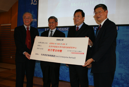 Majlis penyampaian sumbangan oleh Kumpulan Syarikat Hai-O Berhad Malaysia kepada Pusat Pengajian Melayu China Universiti Pengajian Bahasa-Bahasa Asing Beijing (BFSU) telah diadakan di BFSU hari ini. Dalam majlis itu, Ketua Pengarah Kumpulan Hai-O, Encik Tan Kai Hee telah menyampaikan sumbangan sebanyak 100 ribu RM kepada Pusat Pengajian Melayu China bagi mendorong perkembangan pusat itu pada masa hadapan.